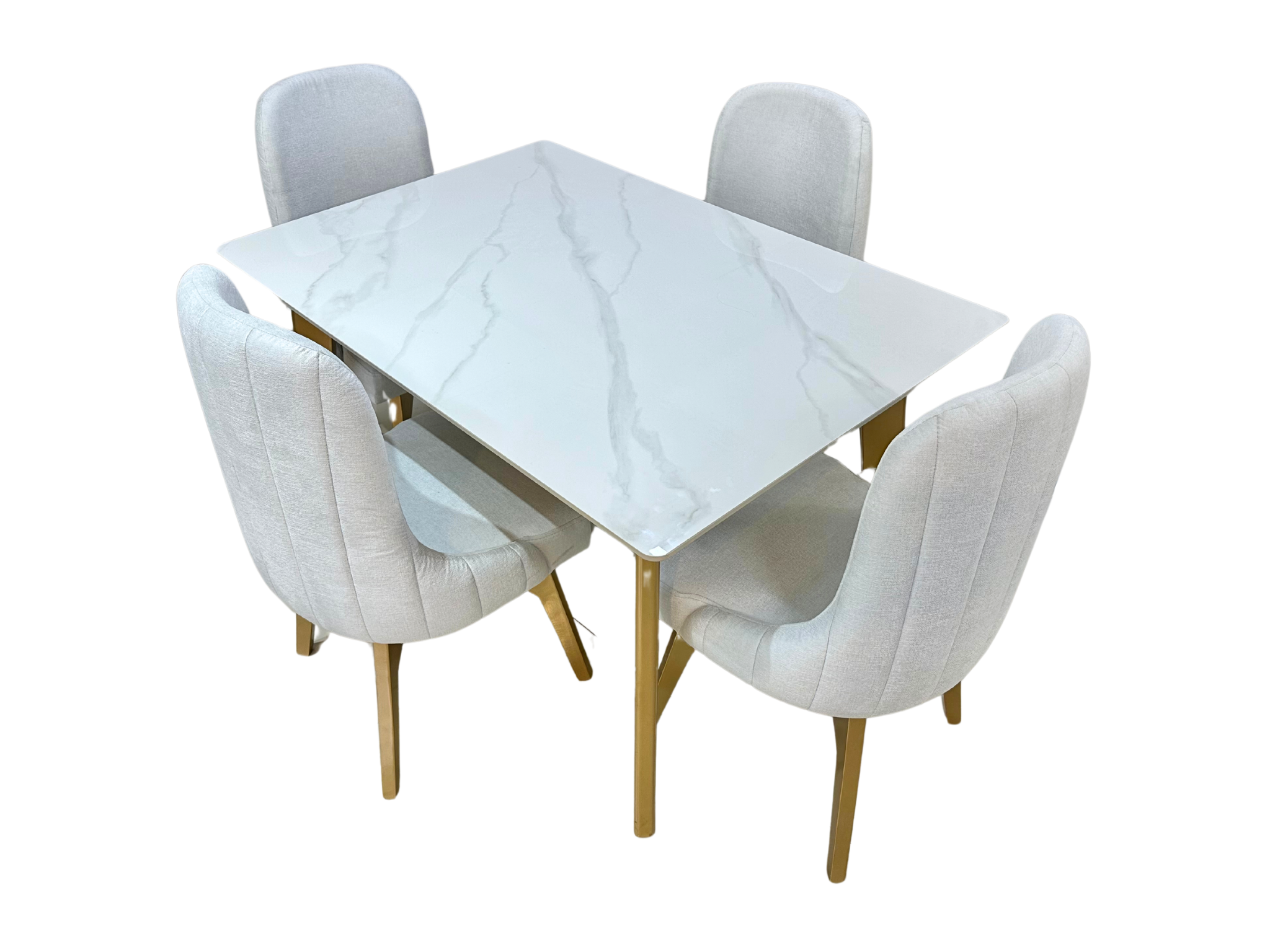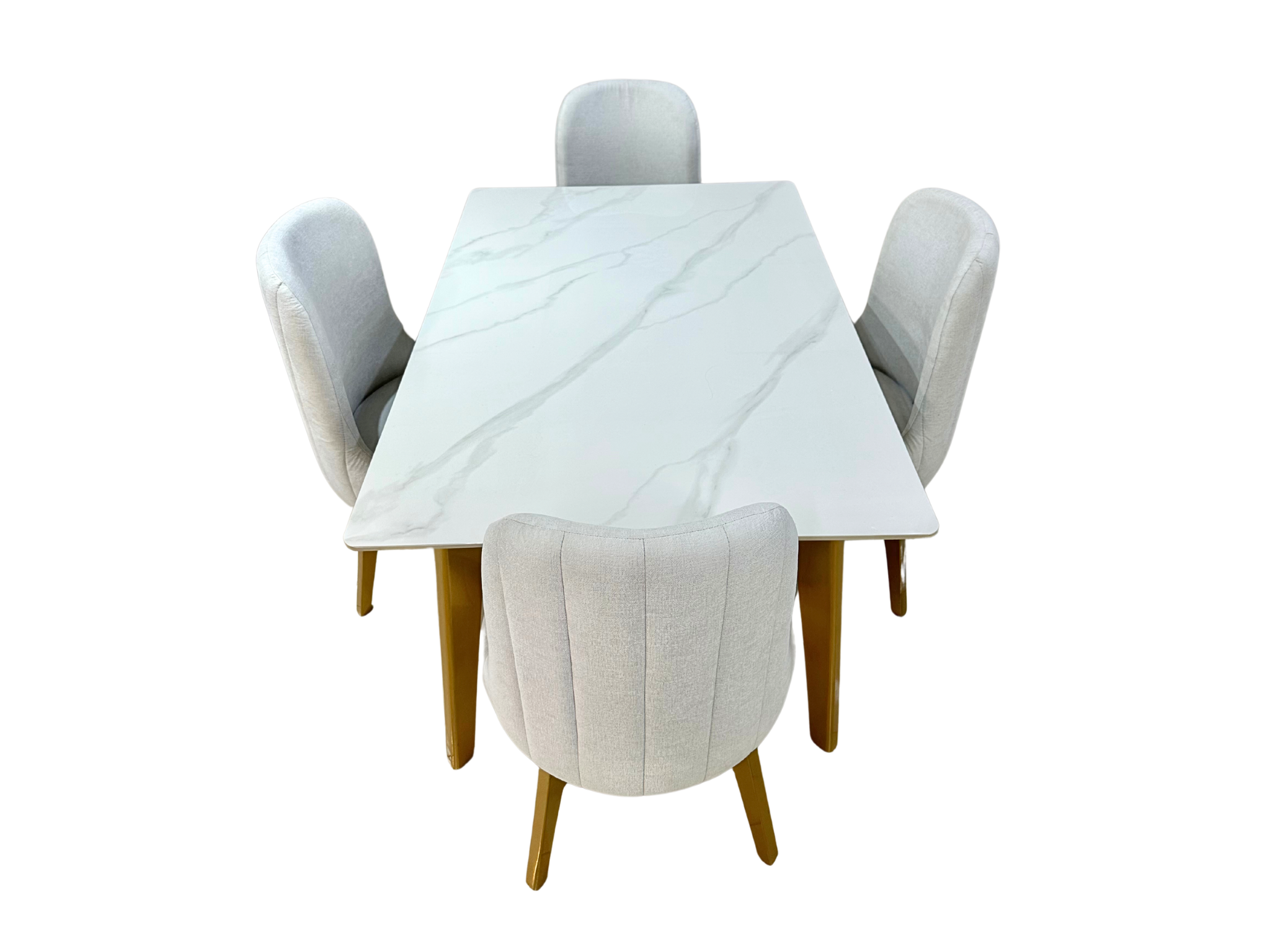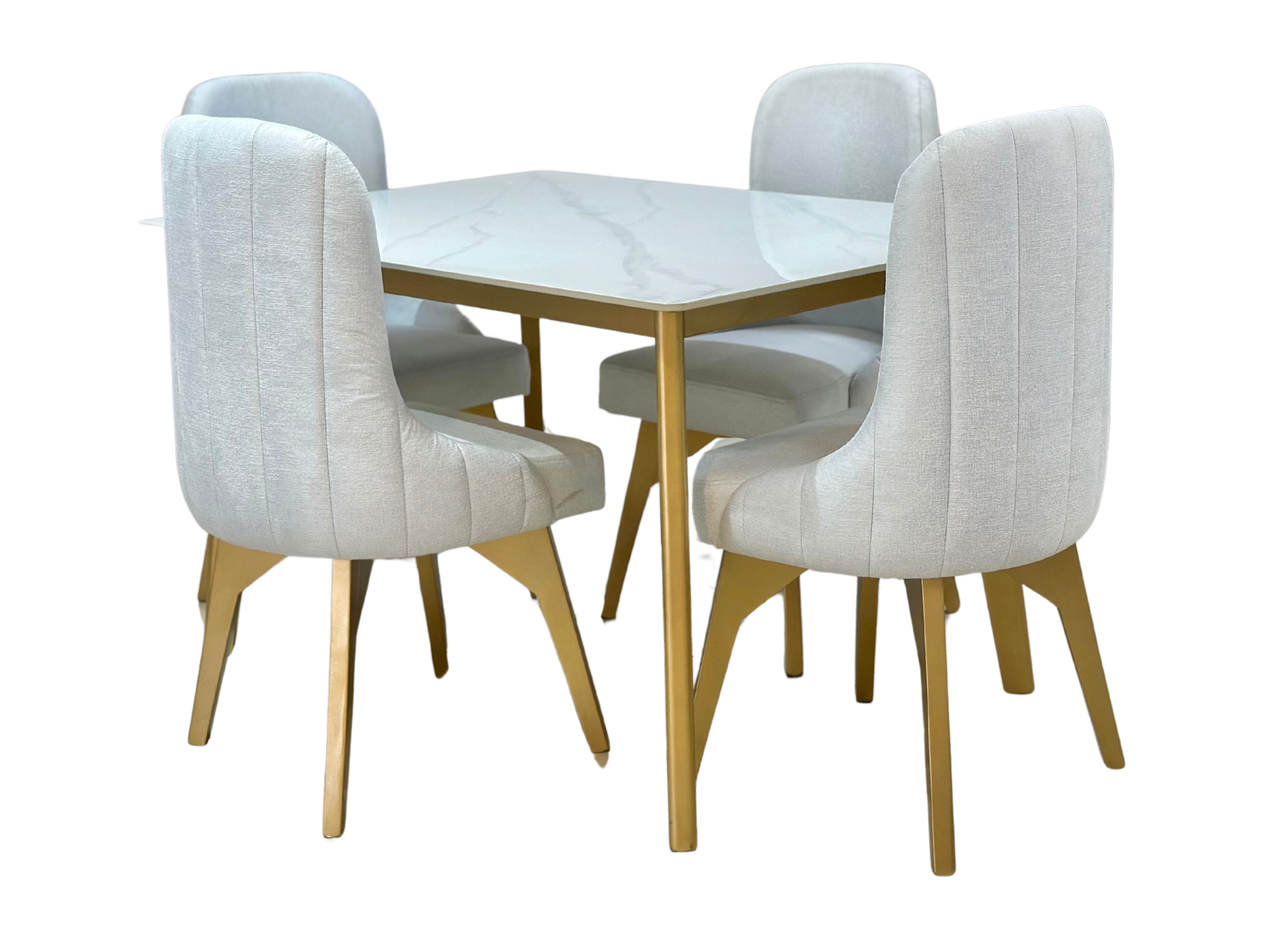 Este comedor stone destaca por su diseño elegante y sofisticado. La mesa, con tapa en piedra sinterizada y base de madera flor morado con detalles dorados, combina modernidad y lujo. Las sillas, tapizadas con material amigable con mascotas y antifluido, ofrecen funcionalidad sin perder estilo. Es una pieza que transforma cualquier espacio con su estética refinada y su gran practicidad.